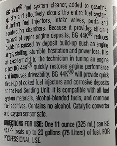 This fuel system cleaner, added to gasoline, quickly and effectively cleans the entire fuel system, including fuel injectors, intake valves, ports and combustion chambers. Because it provides efficient removal of upper engine deposits, this product reduces problems caused by deposit build-up such as engine surge, stalling, stumble, hesitation and power loss. BG 44K quickly restores engine performance and improves driveability. It will provide quick clean-up of coked fuel injectors and corrosive deposits on the fuel sending unit. It is compatible with all fuel system materials, alcohol-blended fuels, common fuel additives. Contains no alcohol. Catalytic converter, and oxygen sensor safe