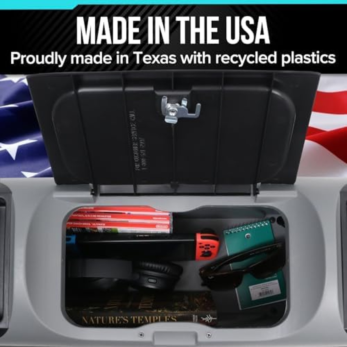 Designed, manufactured and sold in the USA, the Retro Center Console with Plug-In Power Extension offers massive functionality with the classic old-school look. The Center Console not only gives you multiple storage areas, including a hidden drawer, but it also offers power extension capabilities with a 12v power adapter, preventing cord-length issues. Innovative design and features makes it a market leader from a company with over 30 years of console-making experience.