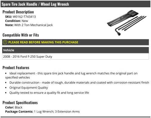 Spare Tire Jack Handle with Wheel Lug Wrench – Compatible with 2008 – 2016 Ford F-250 Super Duty (with 2 Ton Mechanical Jack)