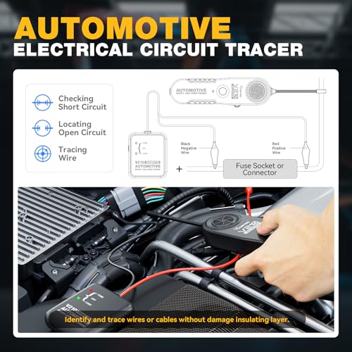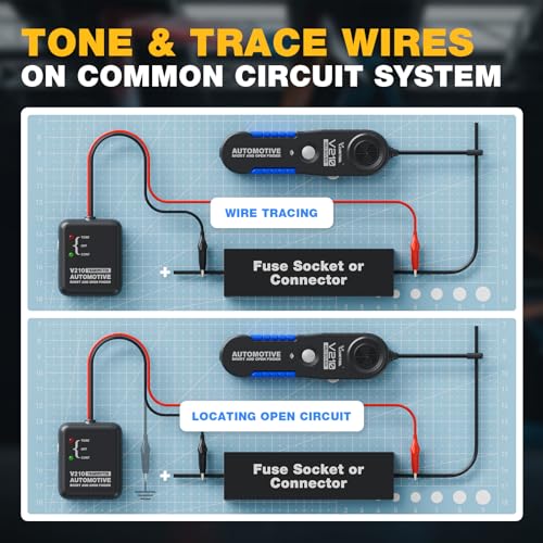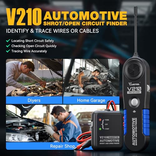 【CHECKING SHORT CIRCUIT】V210 Automotive Short Circuit Finder allows you to find intermittent circuit problems by flexing wires or connectors and listening for a change in the receiver tone without damaging the insulating layer. Receiver with adjustable sensitivity via knob and flexible 7”Probe. Note: The sound signal may be affected by propagation,resistance, shielding, and circuit complexity. To improve accuracy, check wiring step-by-step and complete signals to pinpoint the exact short.